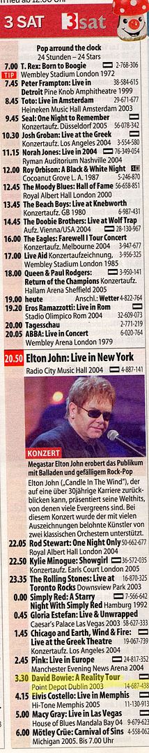 TV Tip 3 Sat Antwort #9 – 22-12-2005, 22:21:34 Bis auf Bowie ist da für mich nix interessantes dabei. :( Und da ich die Reality DVD besitze, ist selbst der Bowie Partnicht von intresse. Außerdem ist die Uhrzeit (3:30 Uhr) nicht geradebowiewürdig. Aber das ist ja im deutschen Fernseh immer so,die besten Sendungen laufen im Nachtprogramm. Quote Selected